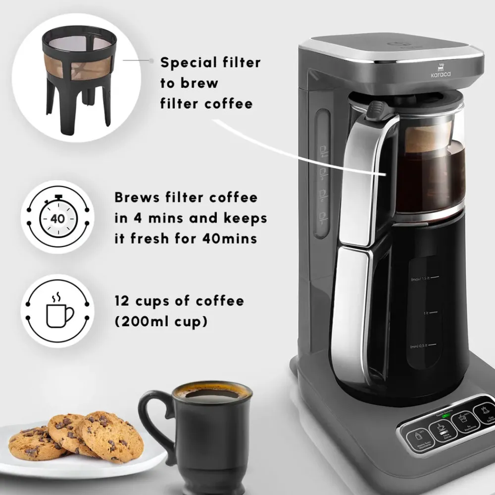 Karaca Caysever Robotea Pro 4 in 1 Talking Automatic Tea Maker Kettle and Filter Coffee Maker, 2500W, Space Grey