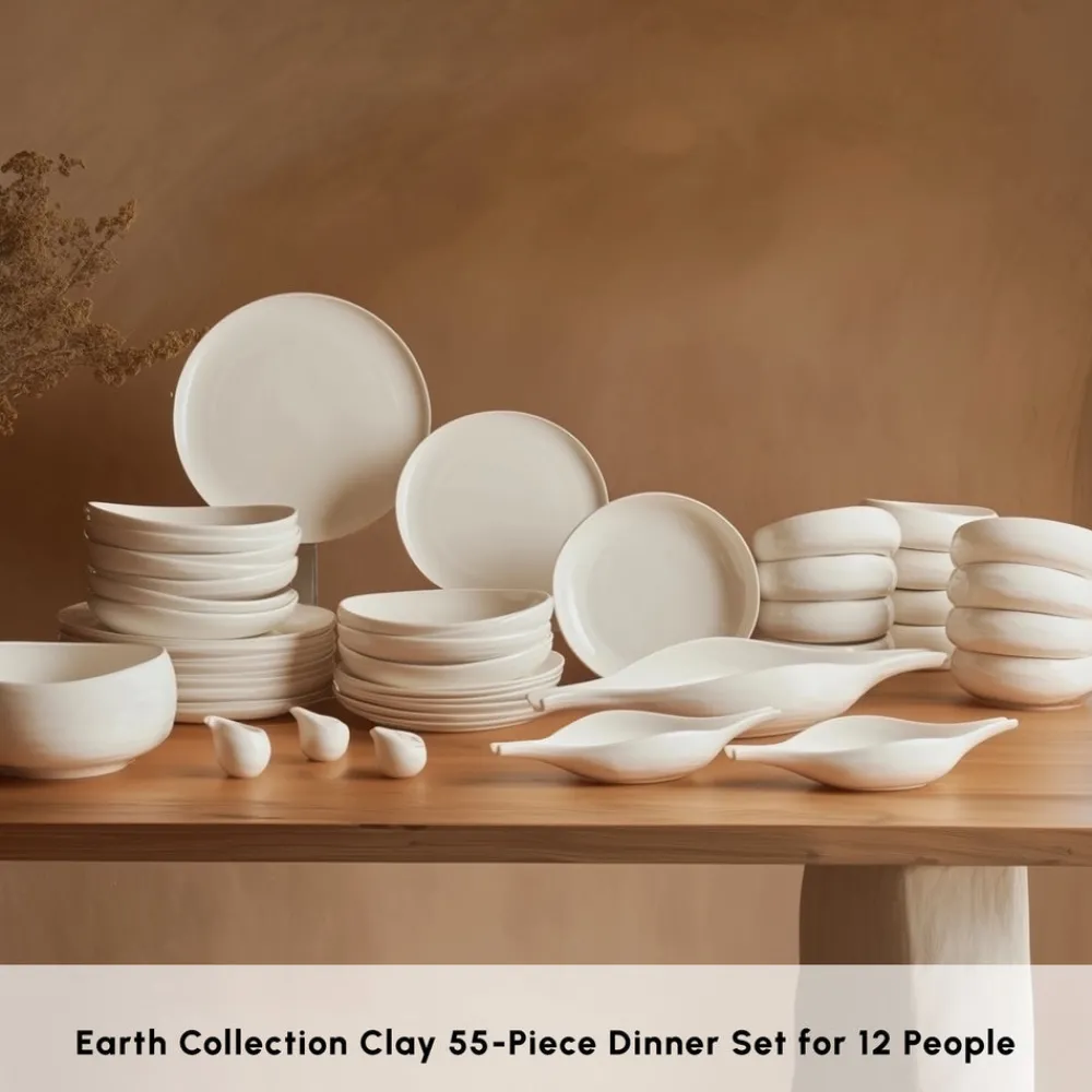 Karaca Earth Collection Clay 55-Piece Porcelain Dinner Set for 12 People, White