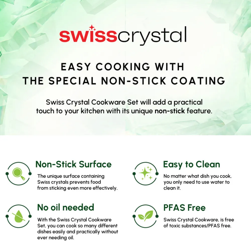The SwissCrystal Cookware Set’s premium crystal-coated surface makes cleaning a breeze. Simply wipe it clean with a cloth or rinse with water—no scrubbing required.