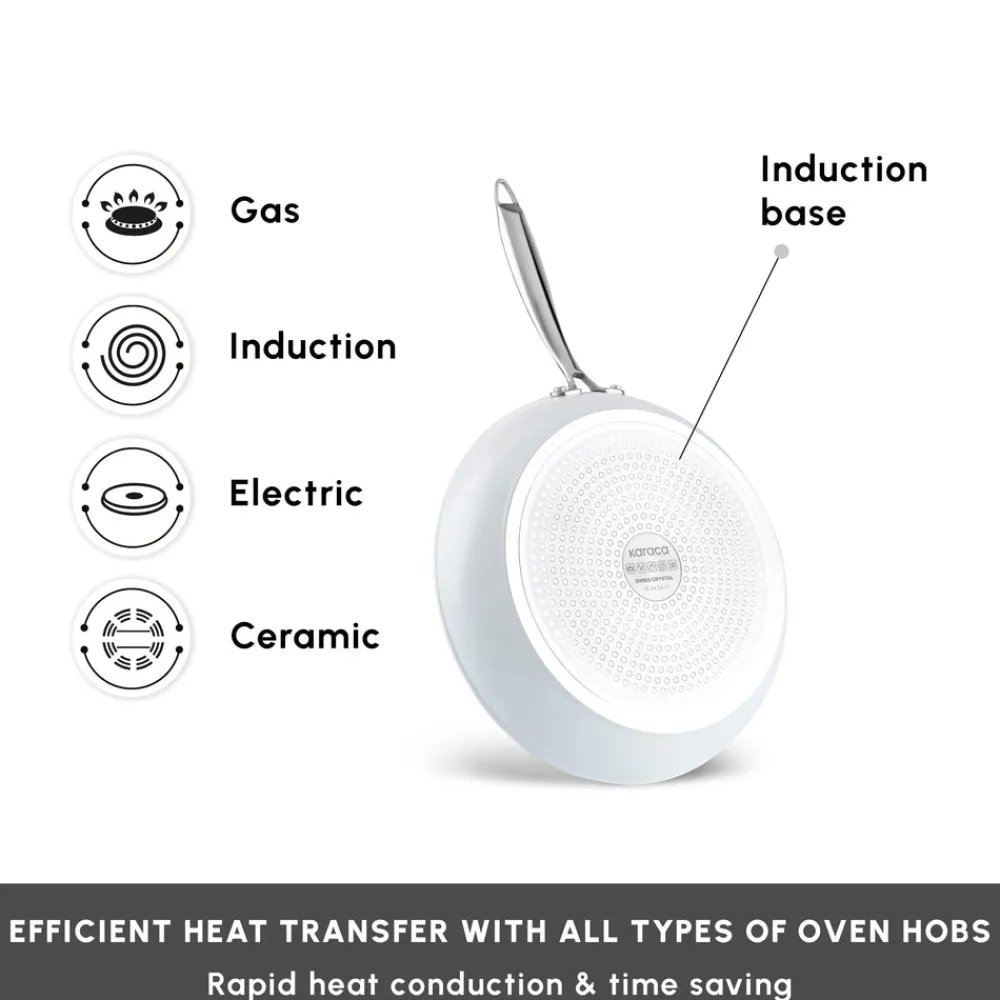 A brand-new pan set with superior non-stick qualities: SwissCrystal. Drawing its strength from the advanced non-stick SwissCrystal surface, the Karaca SwissCrystal Pan Set allows you to cook a wide variety of dishes – from eggs and fish to chicken – without the need for oil. The surface, infused with Swiss crystals, is free from potentially harmful chemical compounds such as PFAS, ensuring a healthier cooking experience. It’s also remarkably easy to clean – a brief soak in water is often all it takes. Designed with both practicality and performance in mind, this durable set is suitable for use in the oven, allowing you to effortlessly transition from hob to oven when preparing a variety of meals, and giving you even more versatility in your everyday cooking.