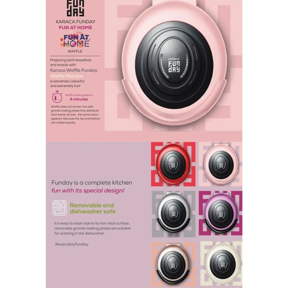 It’s fun to prepare both breakfast and snacks with Karaca Funday Waffle Maker! Funday, which cooks the waffles equally and more deliciously by distributing the heat homogeneously with its natural granite plates, also helps you to transfer the waffles to the plates in one piece without breaking them, via the non-stick feature of the plates. Moreover, it does all this in just 4 minutes. It is easy to clean with its non-stick surface, removable plates are suitable for washing in the dishwasher.