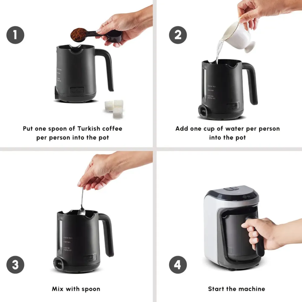 The machine brews coffee quickly and it is easy to use. The stainless steel body keeps the coffee hot for a long time. It brings out the intense flavour of the coffee and offers a richer aroma. Karaca Hatır Hüps Turkish Coffee Machine with Milk, prepares roasted Turkish coffee, hot milk chocolate and instant coffee at the right consistency and in the best possible time. It is left to you to enjoy the incomparably delicious taste of coffee Hatır Hüps Turkish Coffee Machine with Milk is the first device of its kind in the world that can prepare both roasted Turkish coffee and other delicious hot drinks with milk. The Hatır Hüps coffee maker, which prepares Turkish latte, hot milk chocolate and instant coffee with milk to the ideal consistency, heats the coffee and other beverages to the right level without burning them thanks to heat regulation. In addition, the smart sensor of the device is designed to prevent spilling drinks. The color selection suits any style, and the exceptional design takes up as little space as possible in the kitchen. Another reason for the popularity of Hüps Turkish Coffee Machine is its easy cleaning. This product should not be cleaned in the dishwasher. It can be cleaned with a soft sponge.