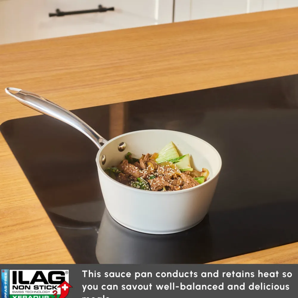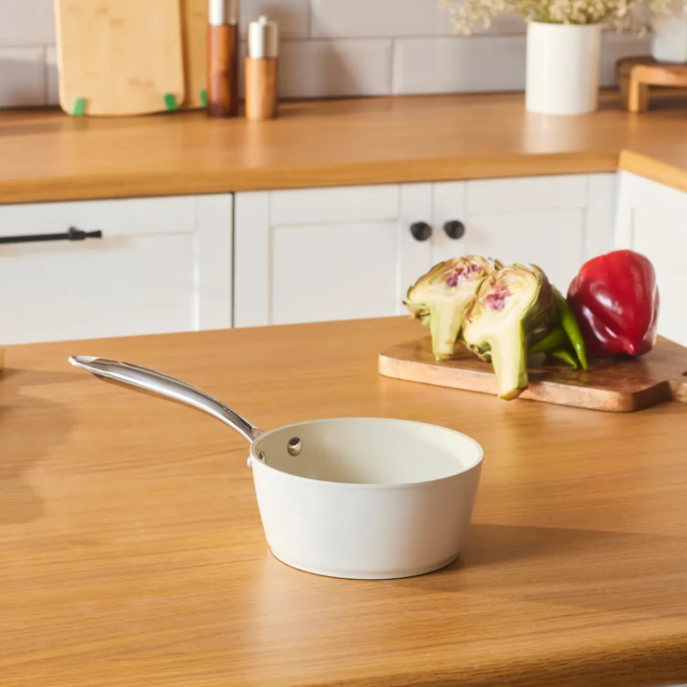 Karaca Swiss Crystal Almond Cream Non-Stick Induction Stainless Steel Handle Saucec Pan, 16cm, Cream
