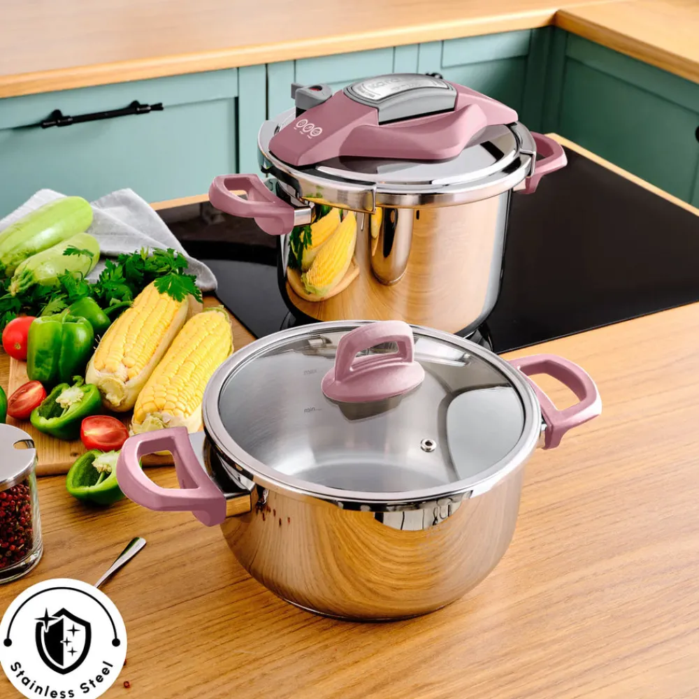 Karaca Perfect 2-Piece Stainless Steel Induction Pressure Cooker Set, 4L+6L, Pink Silver