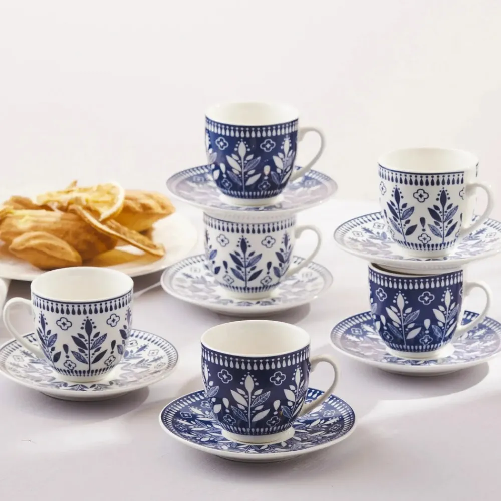 The design of the cups features the dominance of white and blue. The saucers are used to keep the cups warm. They are easy to clean. With its stylish design, quality materials, long-lasting structure, and practical features, you can make your coffee enjoyment even more special