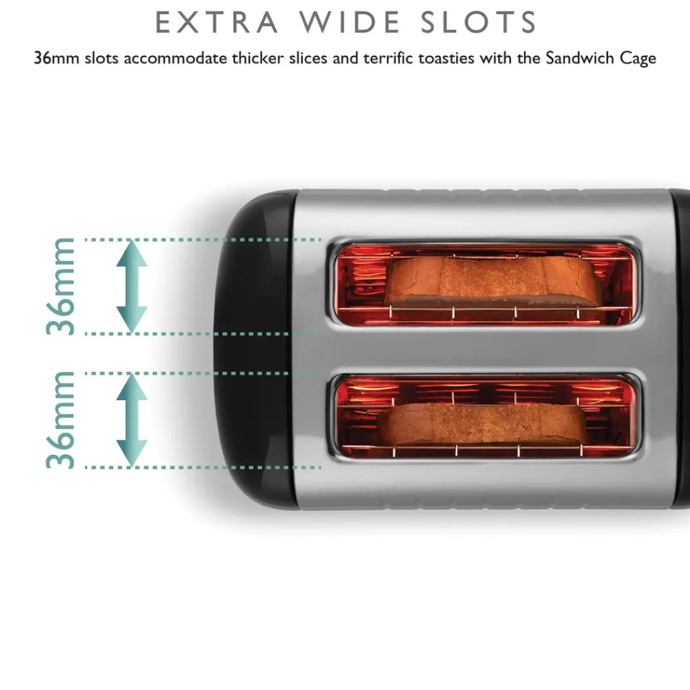 Each extra wide slot measures 36mm so you can toast thicker slices of bread, make toasted sandwiches, toast muffins and teacakes. The optional extra sandwich cage allows you to make delicious toasties.