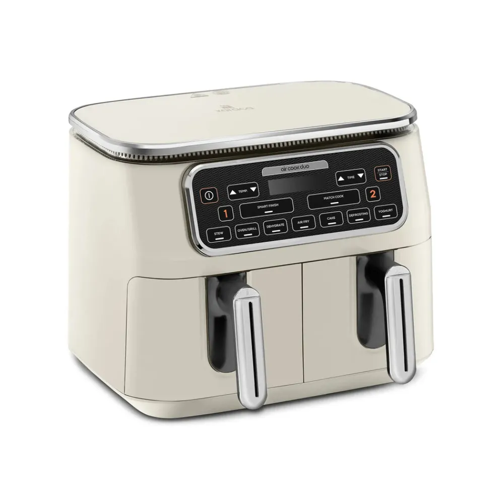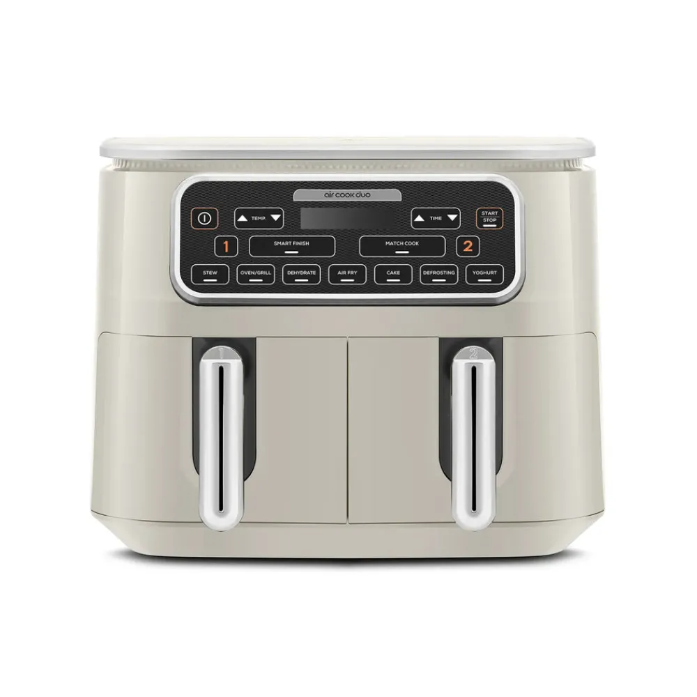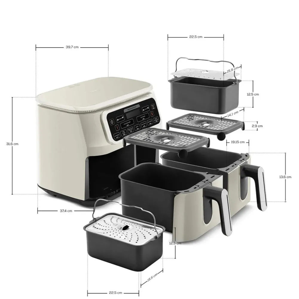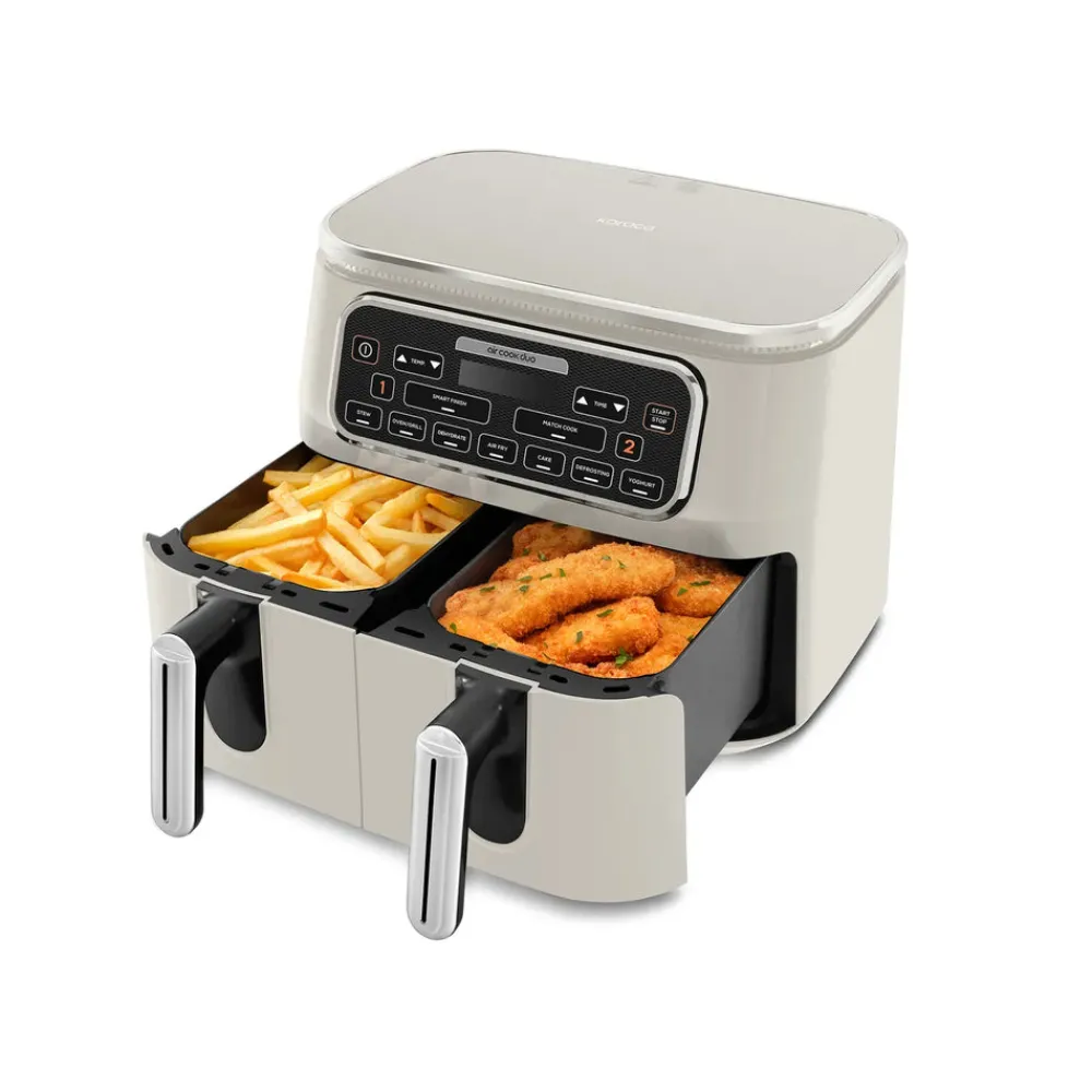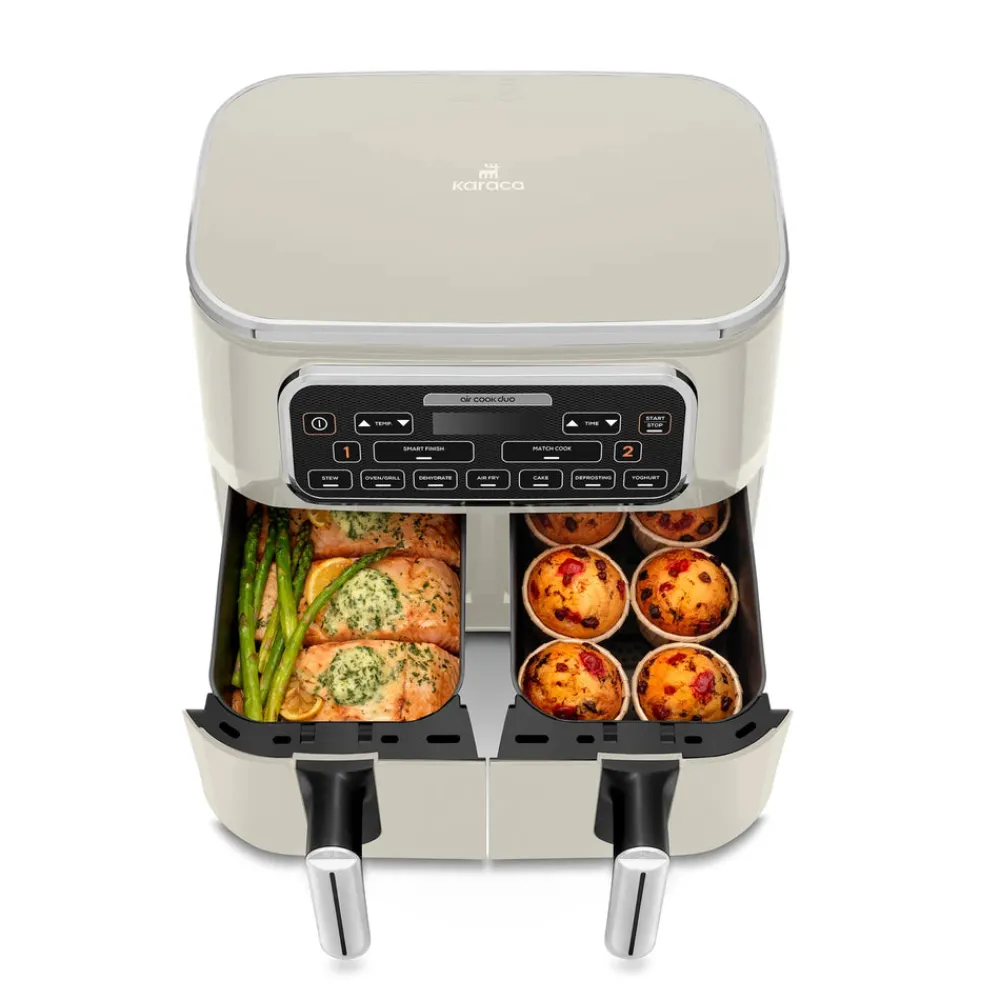With the Karaca Air Duo Cook, you can easily prepare a double portion of the same meal in two spacious compartments, each with a capacity of XXXL 4 + 4 liters, at the touch of a button. You can also manually adjust the temperature and time according to your recipe. Plus, while cooking in two separate compartments, the aromas of the dishes do not mix.