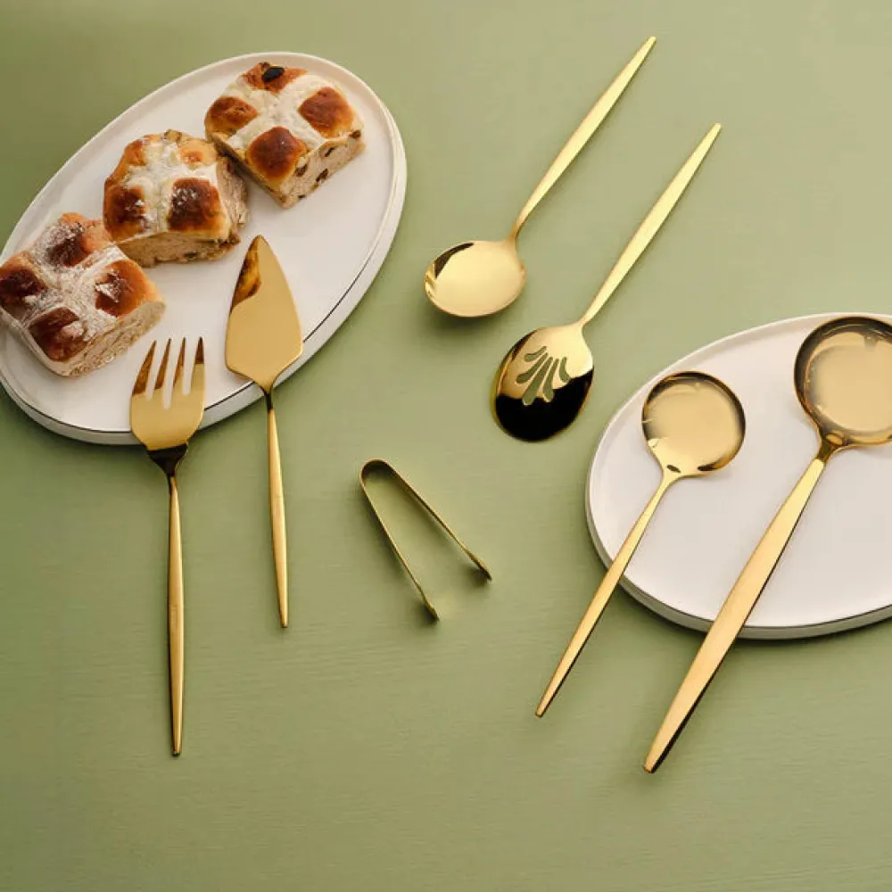 The set includes all the essential serving tools, such as a serving spoon, slotted spoon, serving fork, cake server, big soup ladle, small ladle, and sugar tongs. The durable stainless steel ensures a long-lasting, polished look that complements any table setting, whether it’s a casual family dinner or a formal gathering.