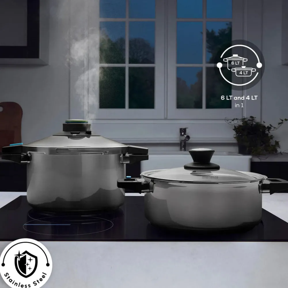 Karaca Quick and Safe 2-Piece Stainless Steel Induction Pressure Cooker Set, 4L+6L, Black Silver