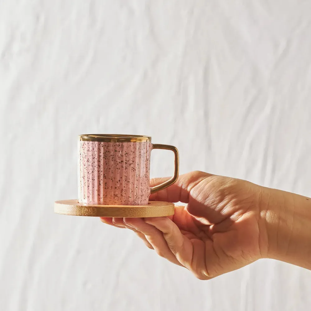 Karaca Bone China Espresso Turkish Coffee Cup Set with Bamboo Tray for 6 People, 12 Piece, 90ml, Gold Multi