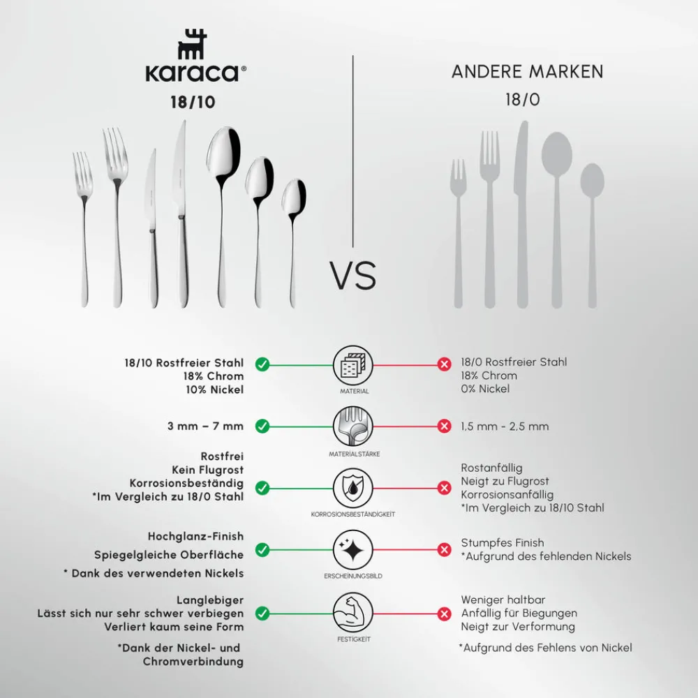18/10 stainless steel contains more nickel compared to 18/0, thus, it’s it’s more durable, heat resistant, rust resistant, and anti-corrosive. Commonly used for fine dining due to its more shiny and stracht-resistant surface. Karaca cutlery sets are extra heavy weight meaning Premium quality that feels very sturdy in your hand and is very difficult to bend, compared to medium or even heavyweight cutlery. The Premium quality comes from both 18/10 stainless steel and the thickness level varies between 3mm and 7mm.