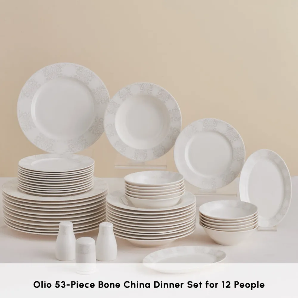 Karaca Forever Bone China New Olio 53-Piece Dinner Set for 12 People, White