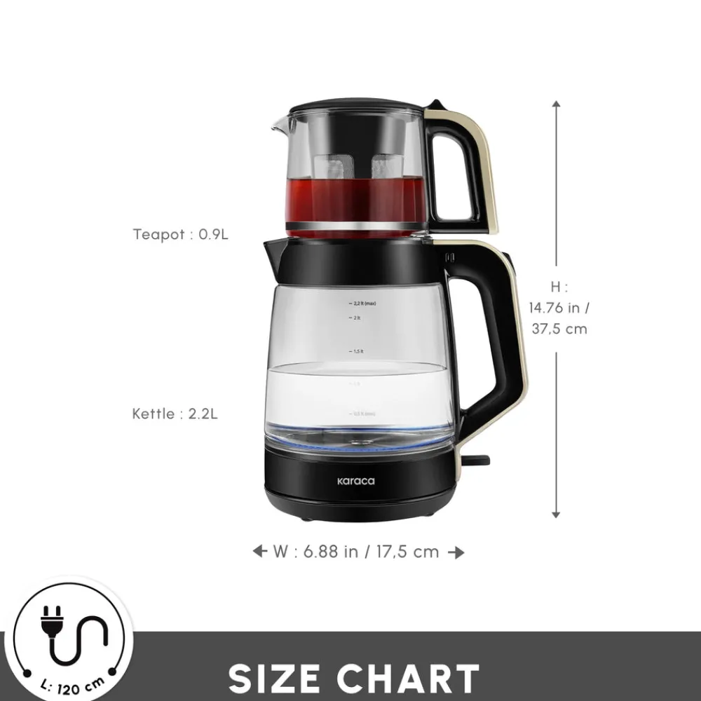 Karaca Glass Tea XL Tea Maker features a 0.9-liter capacity glass teapot and a 2.2-liter capacity water kettle. With its XL capacity, you can brew *35 cups of tea at once, allowing you to enjoy tea with your large family, guests, or a group of friends. The glass design of both the teapot and water container ensures a healthy and long-lasting use. Additionally, its transparency allows you to easily see the remaining amount of water or tea, enabling you to refill when necessary. The water kettle’s lid allows it to also function as a kettle. The Glass Tea XL Tea Maker saves energy with its automatic keep-warm function, keeping your water hot during your tea time. Its 360° rotating base provides easy handling.