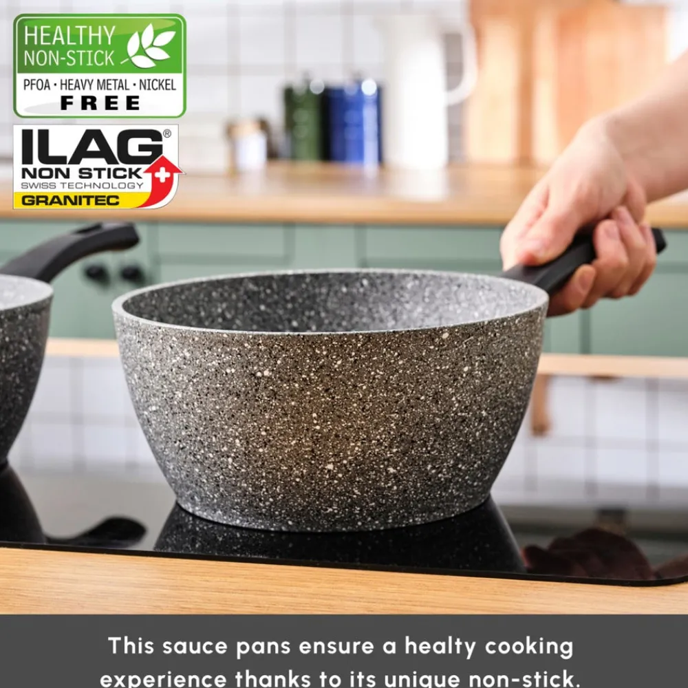 Crafted from Biogranit material, this three-piece saucepan set ensures durability and reliability, perfect for daily cooking tasks in your kitchen.