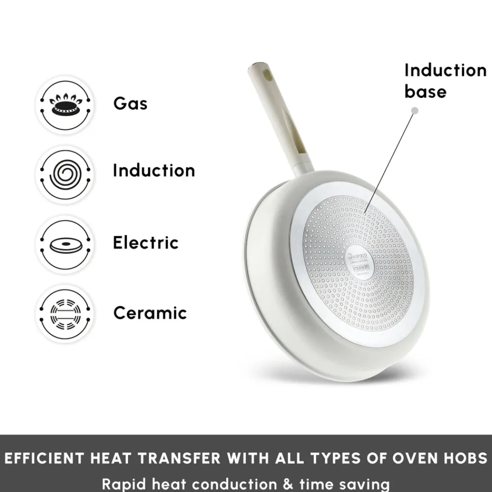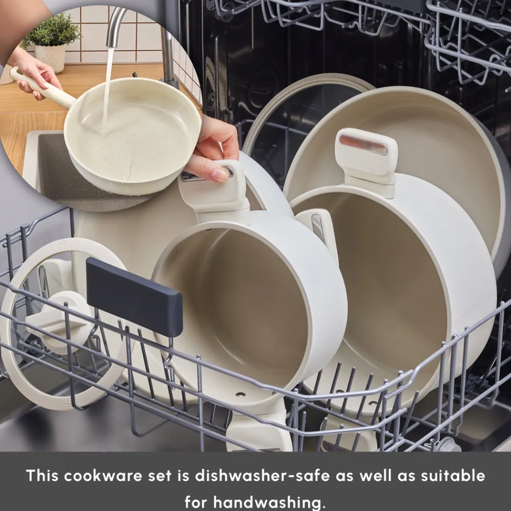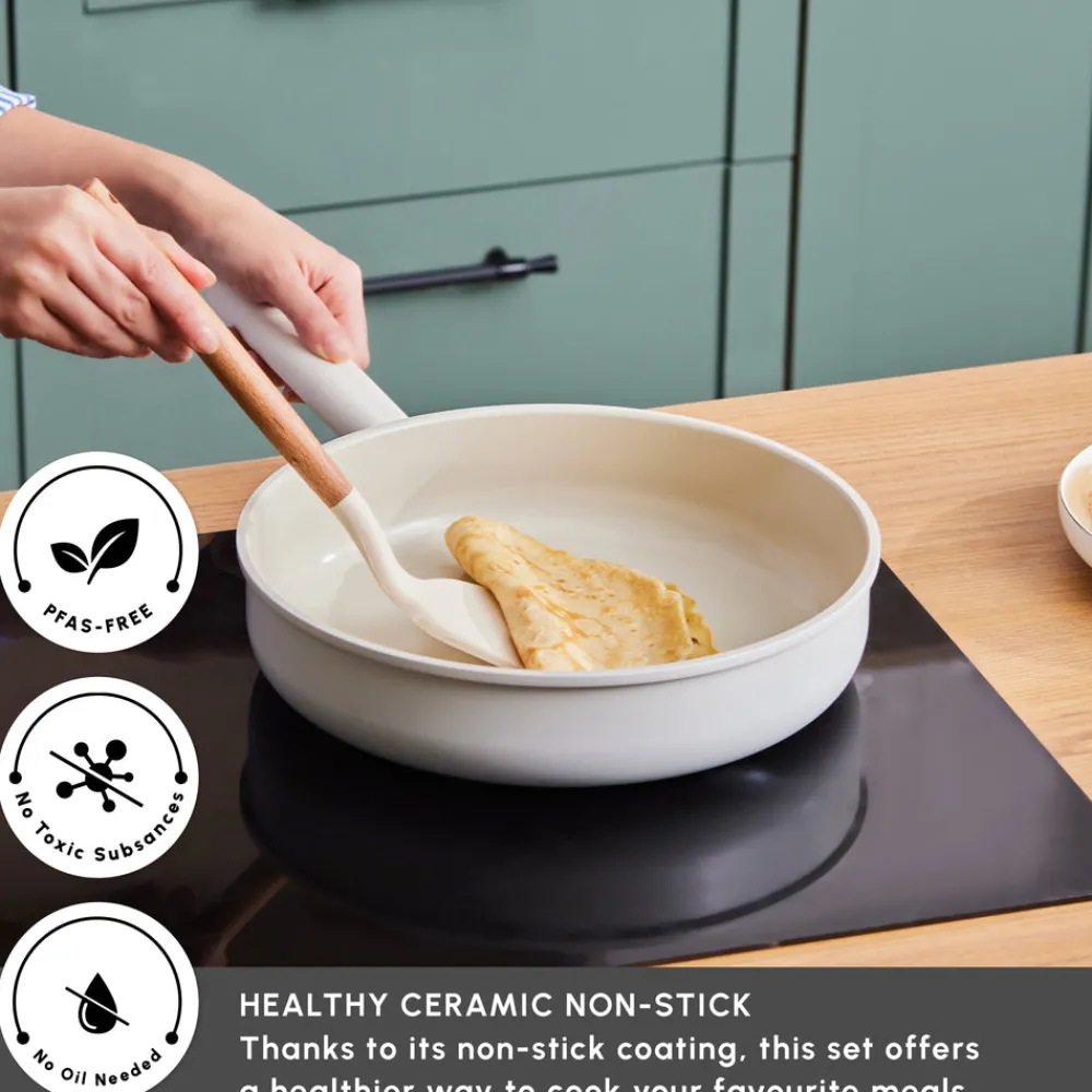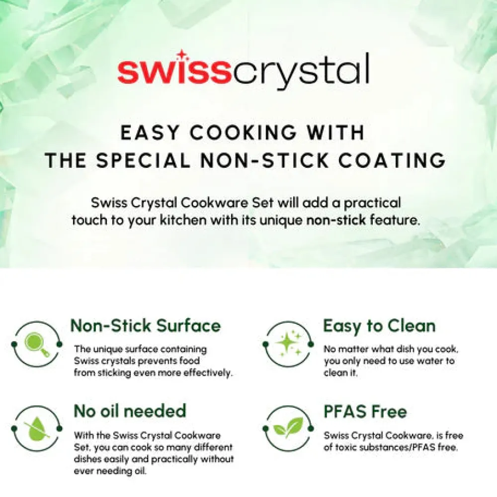 Karaca Swiss Crystal Valenti Ceramica 7-Piece Cookware Set features a superior non-stick surface, allowing you to easily cook dishes like eggs, chicken, fish, meatballs, crepes, and rice with little to no oil. The non-stick surface does not contain harmful chemicals suach as PFAS, which are hazardous to human health. The ergonomic handles provide a comfortable grip.
