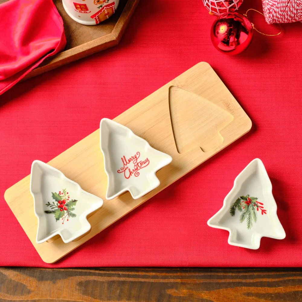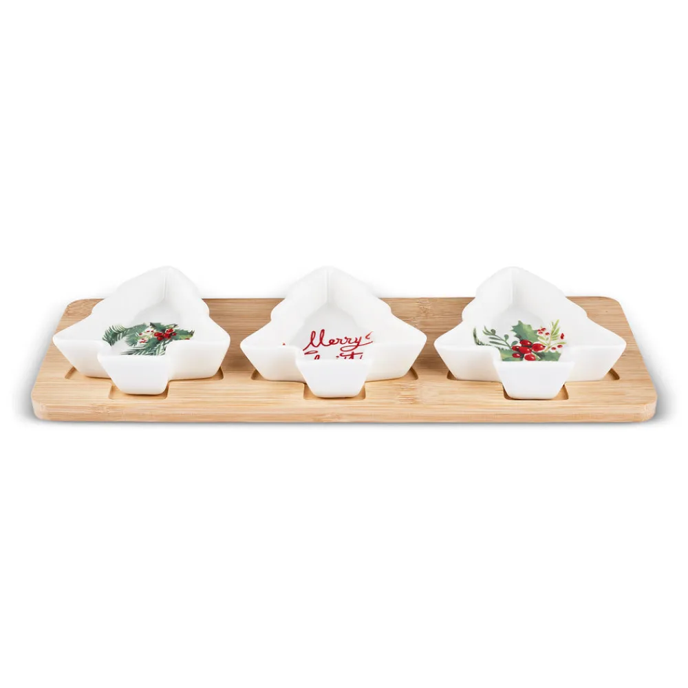 Karaca New Year Christmas 3-Piece Bamboo Pine Tree Snack Bowl, Multi
