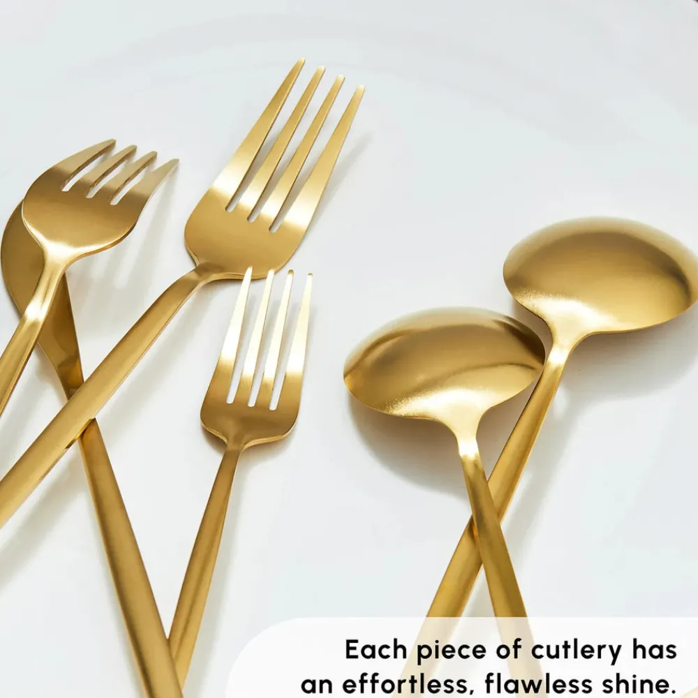 The sleek, modern design of the cutlery pieces features a beautiful matte gold finish complemented by bella accents, making them a stylish addition to any dining table.