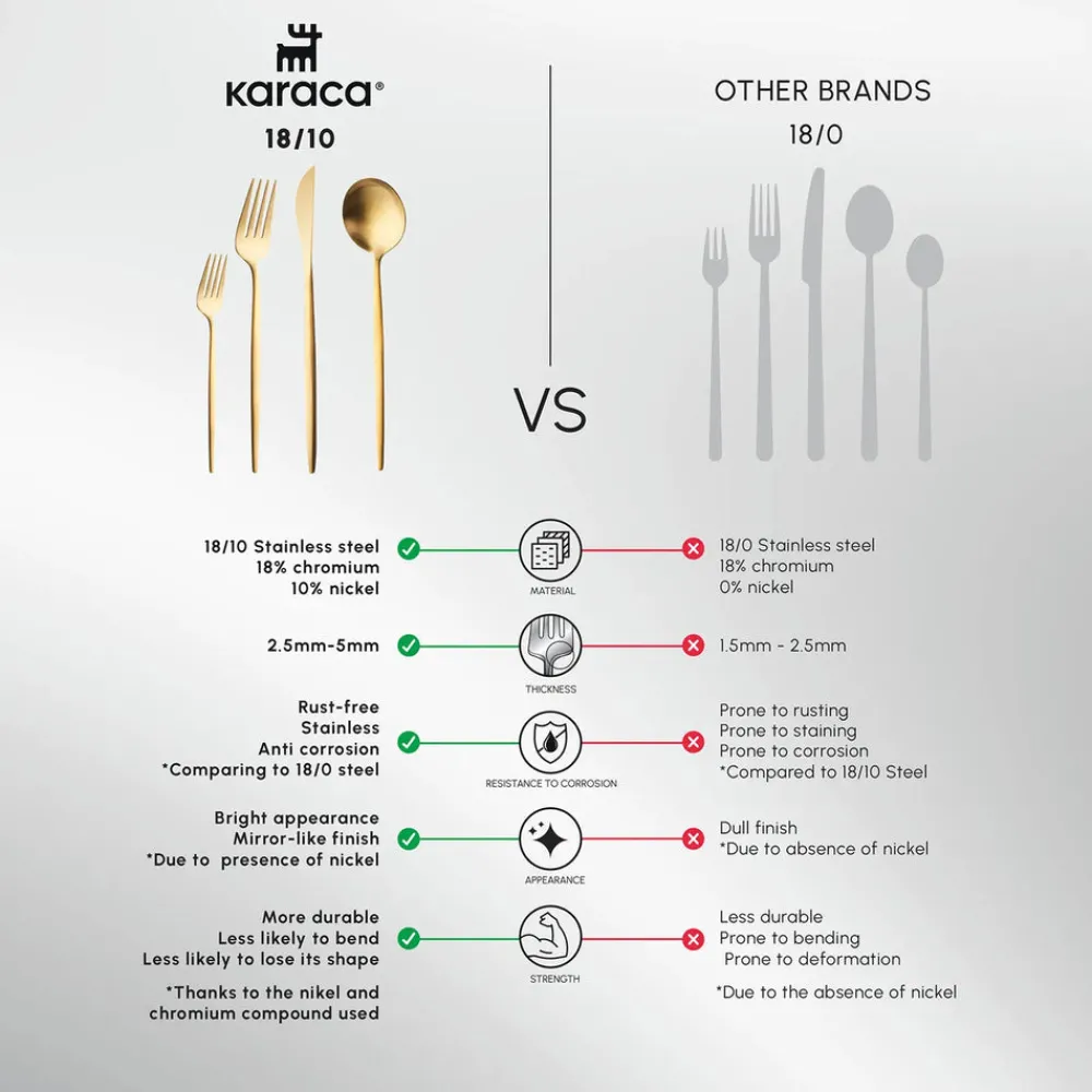 18/10 stainless steel contains more nickel compared to 18/0, thus, it’s it’s more durable, heat resistant, rust resistant, and anti-corrosive. Commonly used for fine dining due to its more shiny and stracht-resistant surface. Karaca cutlery sets are extra heavy weight meaning Premium quality that feels very sturdy in your hand and is very difficult to bend, compared to medium or even heavyweight cutlery. The Premium quality comes from both 18/10 stainless steel and the thickness level varies between 3mm and 7mm.