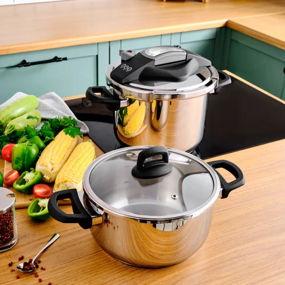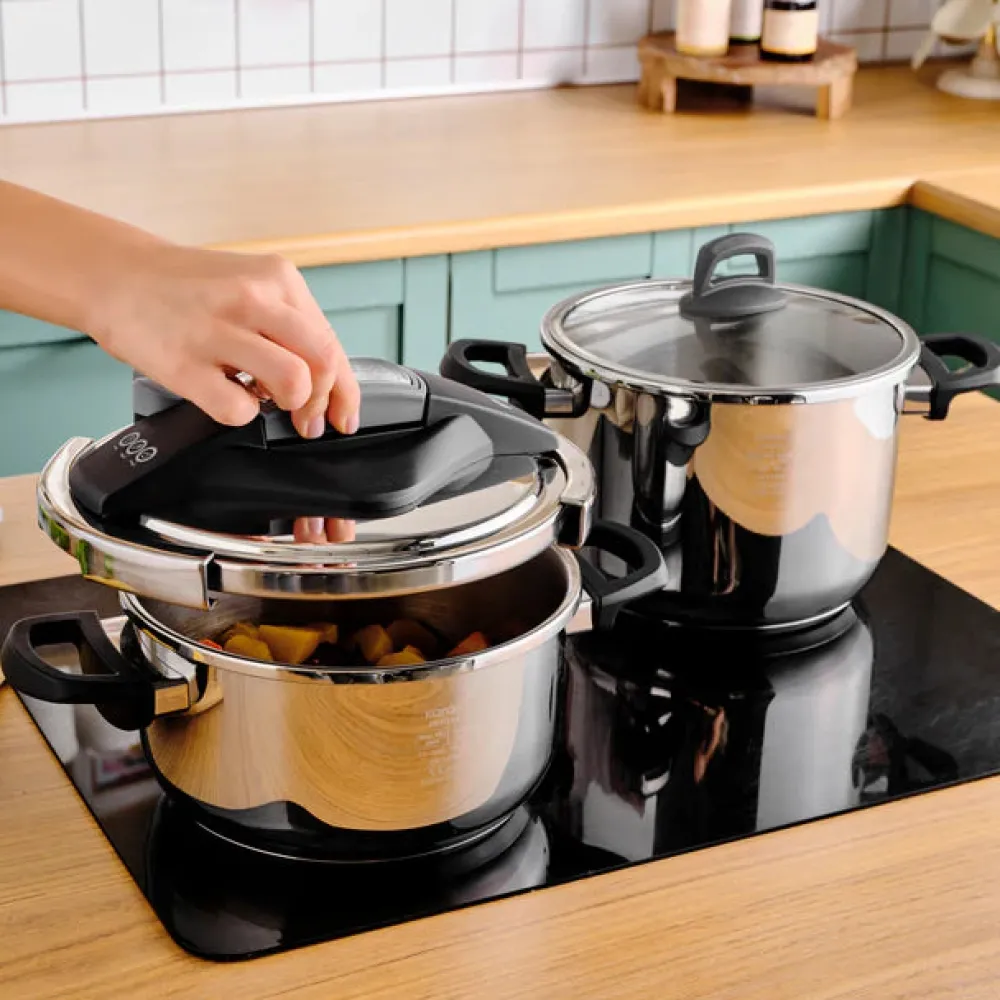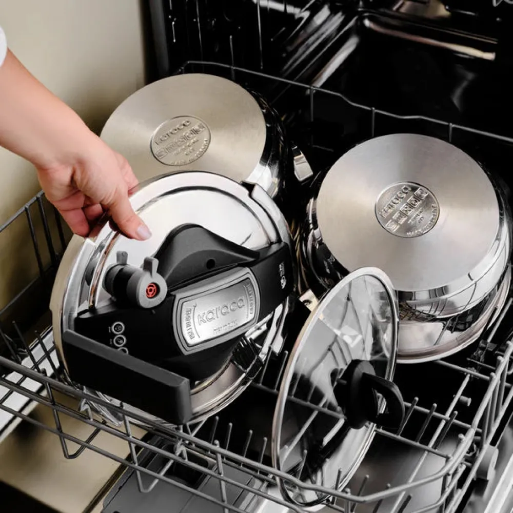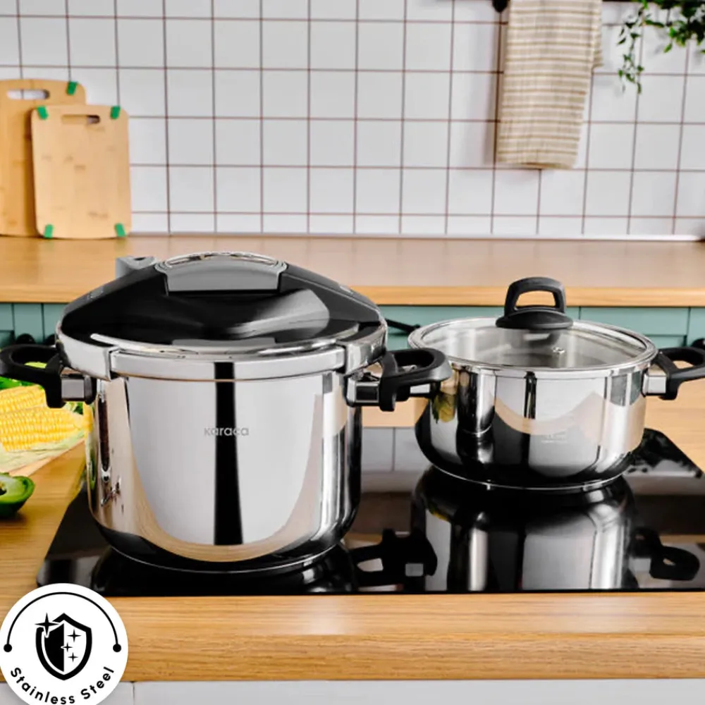 Karaca Perfect Stainless Steel Induction Pressure Cooker Set, which is made of 18/10 stainless steel, are durable and elegant. Thanks to its safety system, it provides safe and easy use. Thanks to it’s corrosion resistance, it is suitable for daily use. It is resistant to high temperature. It saves time and energy. Thanks to the cooking program, it regulates the cooking temperatures while cooking vegetables, meat, fish and legumes, thus preserving the vitamins and flavors of the foods. Different and ergonomic opening and closing system is easy, fast and safe. Thanks to its improved base system, it provides equal heat distribution and is suitable for use on all stoves, including induction. 2 Years Warranty. It can be washed in the dishwasher.