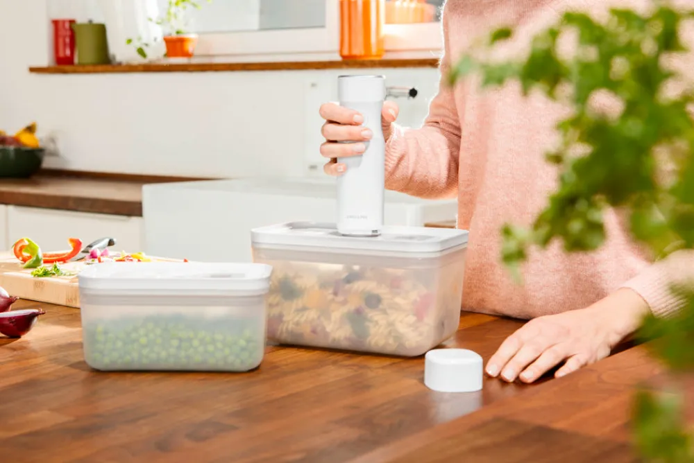 The Fresh & Save Vacuum Pump is the core of ZWILLING’s smart storage system, offering a sleek, quiet, and cordless design. This efficient vacuum pump quickly removes air from your vacuum containers and bags, preserving the flavours and vitamins of your food in seconds. The pump automatically shuts off once the optimal vacuum level is reached, ensuring perfect preservation every time. Powered by a long-lasting lithium-ion battery, it charges quickly via the included USB charging cable. With the Fresh & Save system, you can shop once a week and store fresh fruit, vegetables, meat, and fish in vacuum containers and bags, keeping your food as fresh as the day it was purchased. Prepare meals in advance and store them for later, enjoying freshly prepared dishes whenever you like. The system also allows you to sous-vide cook meat or marinate it for grilling in just 30 minutes using the vacuum bags and containers.
