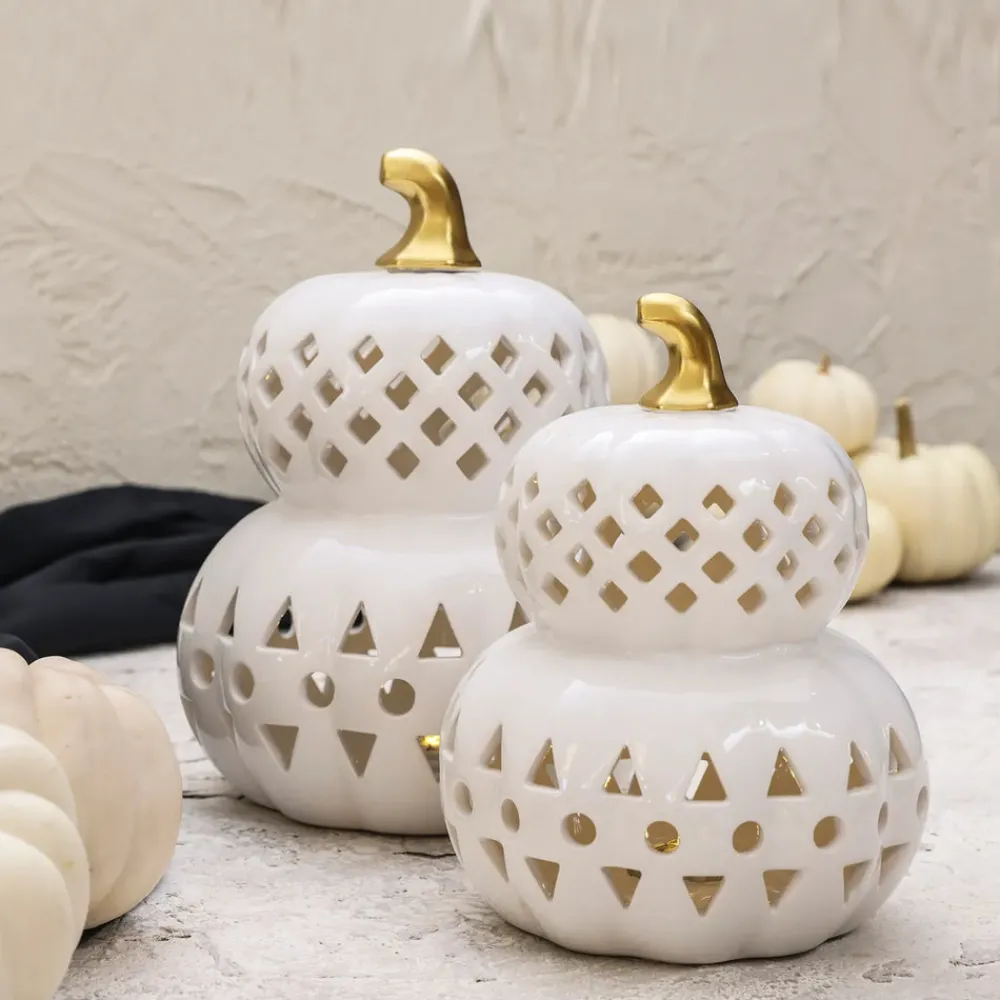 Introducing our Halloween Led Light Trinket, a 24cm piece in enchanting white and gold with a whimsical pumpkin design. It adds a magical touch to your October decor, creating an enchanting Halloween atmosphere with its warm Led light. Illuminate your festivities with this captivating and practical addition.