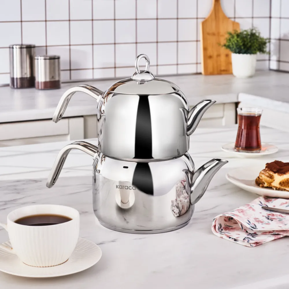 Would you like to start your day refreshed with a perfectly brewed cup of tea? The Karaca Manes Medium-Sized Teapot Set is made of stainless steel, ensuring health and longevity. With a 1.35-liter upper teapot and a 1.95-liter lower pot, it enhances your tea experience with loved ones. Suitable for use on all stovetops, including induction hobs.