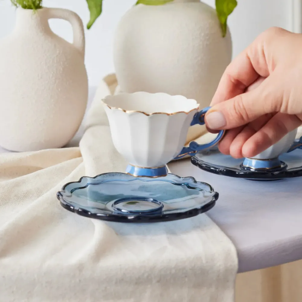 Karaca Samo 4-Piece Bone China Acrylic Plated Espresso Turkish Coffee Cup Set for 2 People, 90ml, Navy Blue Multi