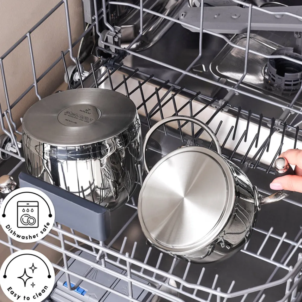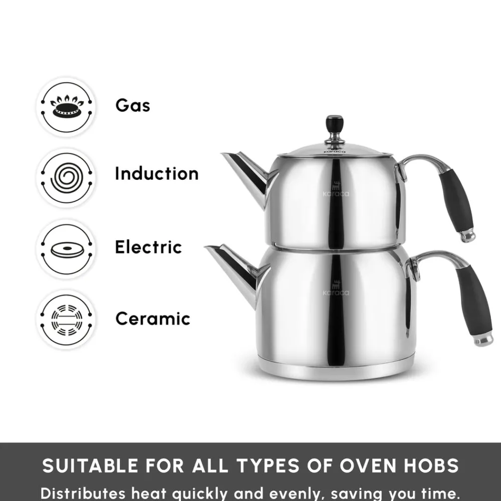 Thanks to its 18/10 Cr-Ni stainless steel structure, Karaca Stella Stainless Steel Teapot Set is extremely durable, offers healthy use and ensures deliciously brewed tea. It consists of a 1-liter teapot and a 2-L water tank. With its heat-resistant handles, it allows for easy pouring.