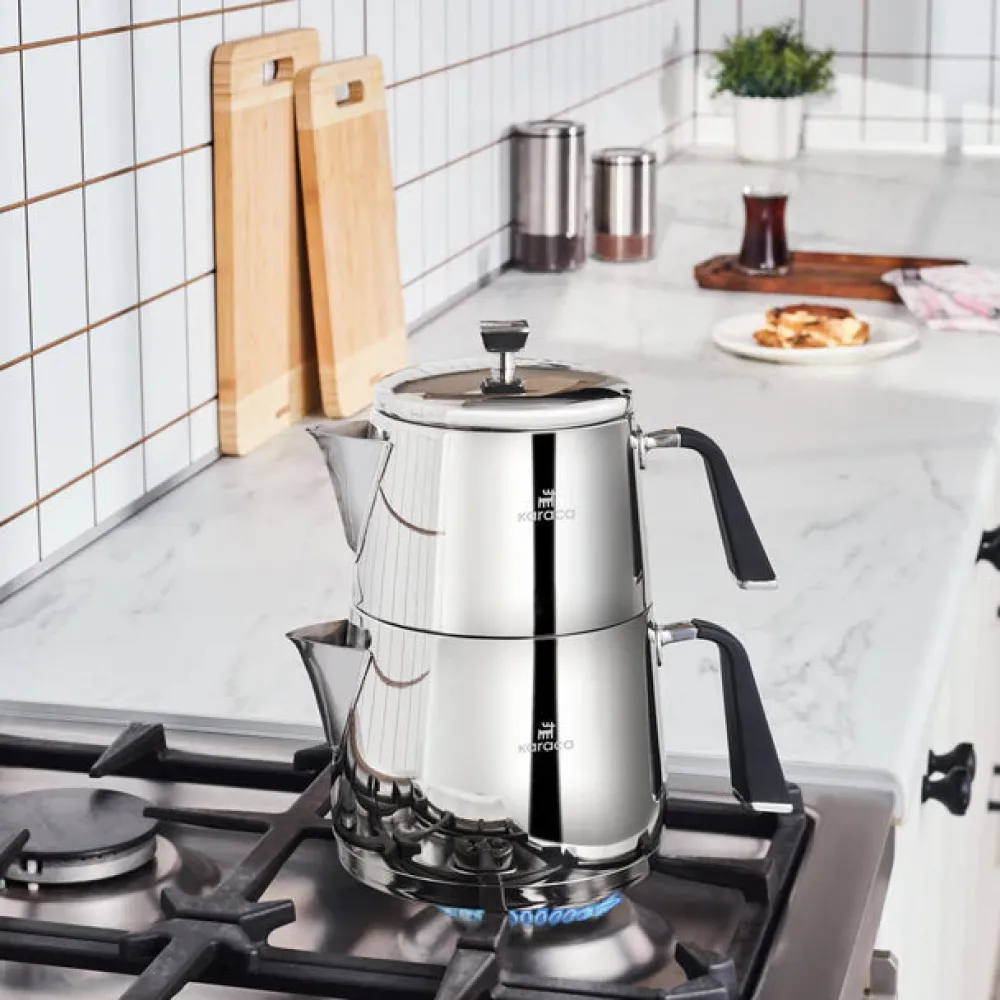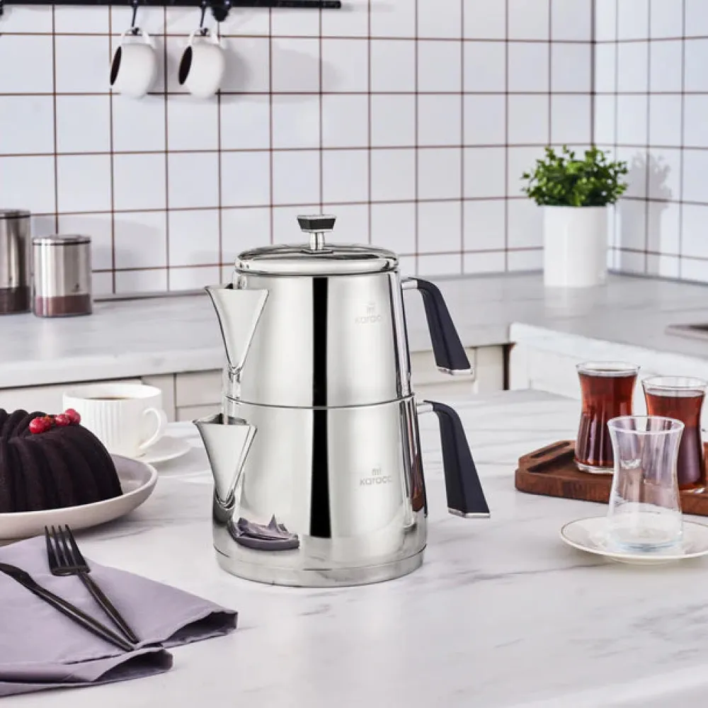 Thanks to its 18/10 Cr-Ni stainless steel structure, Karaca Fiona Stainless Steel Teapot Set is very durable, healthy and brews your tea deliciously. It consists of a 1-liter teapot and a 2-liter kettle. The tea is easy to serve with its non-flammable handles. The teapot has a specially polished surface to preserve the shine of the first day. It saves time and energy thanks to the capsule base, which ensures maximum heat transfer on all types of stove, including induction stoves.
